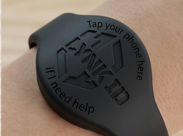 Discreet neck tag for secure wear and emergency access.